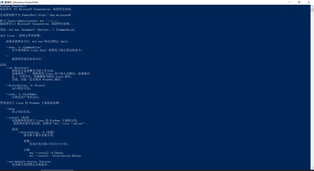 安装WSL 打开powershell,以管理员身份运行,并输入wsl --install