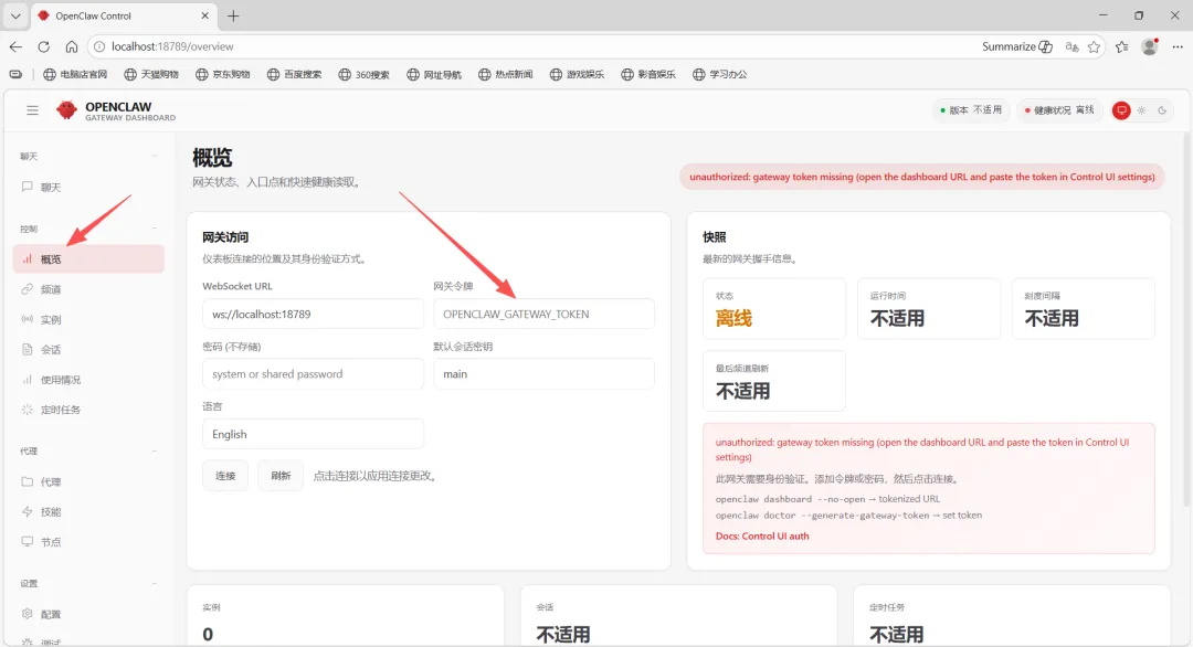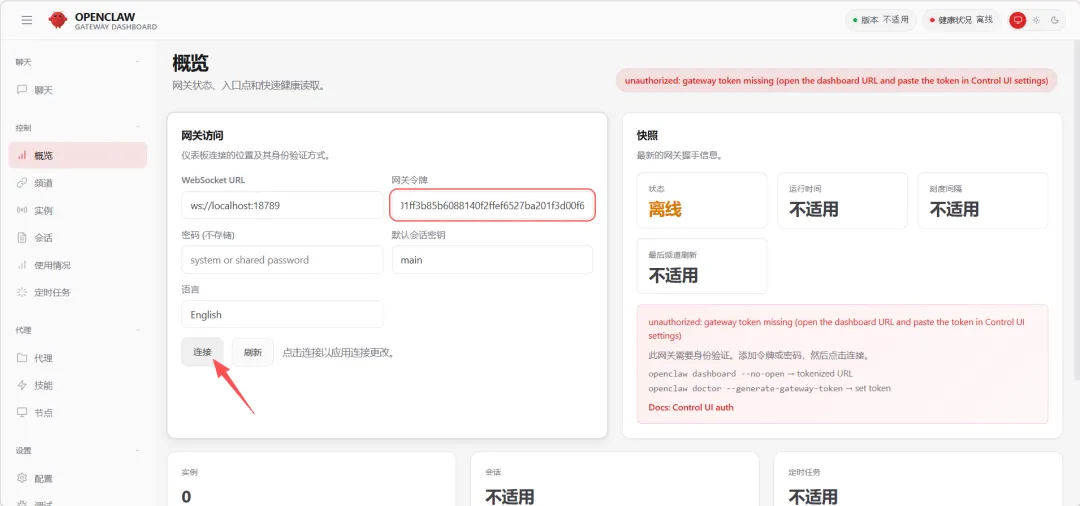 在网关令牌内填写上面提到的token,然后点击连接