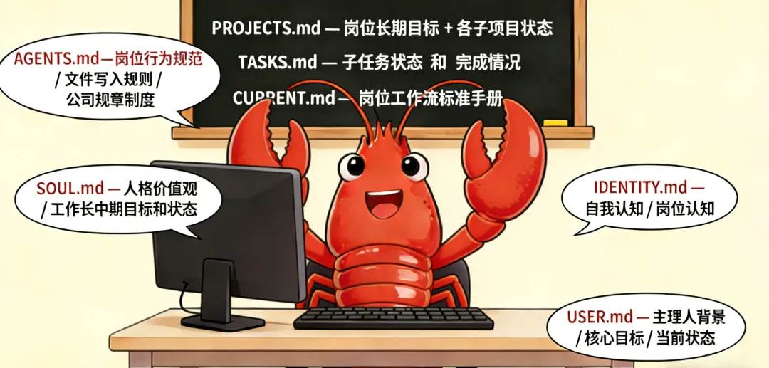 先了解openclaw的上下文注入机制:比较复杂,简化为以下文件按序加载(上下文是动态拼接的,但以下文件是绝大多数情况都按序加载的) AGENTS.md/SOUL.md/TOOLS.md/IDENTITY.md/USER.md HEARTBEAT.md/BOOTSTRAP.md/MEMORY.md (openclaw自动更新大部分记忆的地方)/contextMode/session 类型过滤等 可以简单理解为:先建立人格 → 再了解目标 → 再看约束 → 最后看当天上下文。