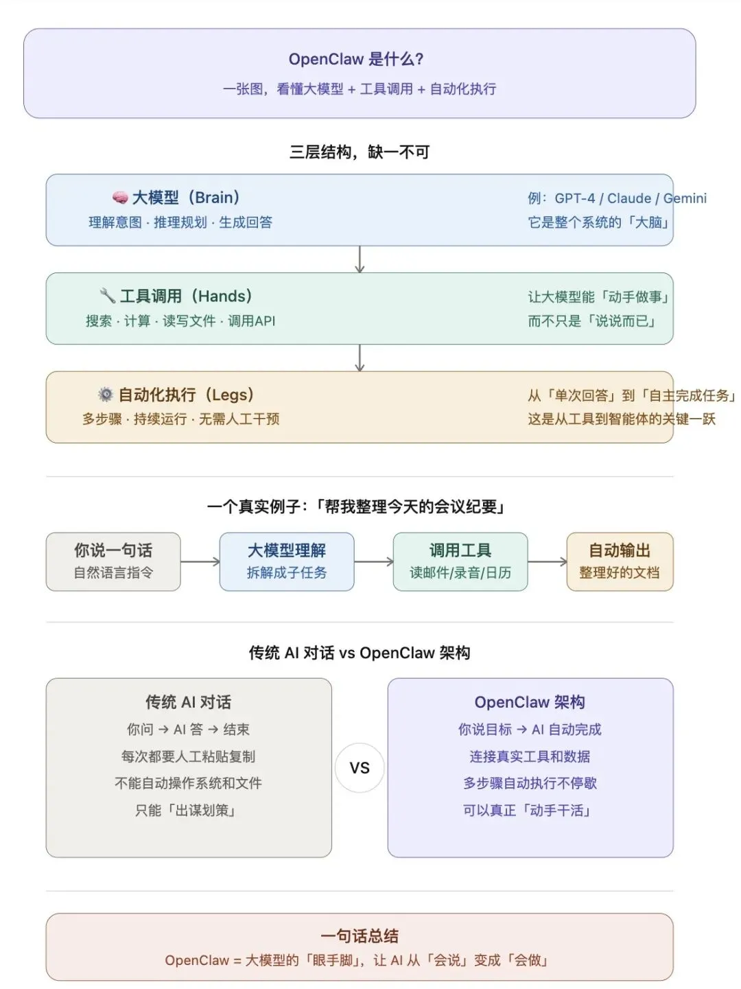 OpenClaw = 大模型的"眼手脚",让 AI 从"会说"变成"会做"。