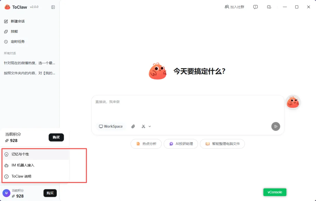 现在很多 AI 工具都在做“会话体验”,但 ToClaw 明显更想做“任务体验”。首页里能直接看到“热点分析”“AI 投研助理”“智能整理电脑文件”这些入口,说明它不是在等你想提示词,而是在告诉你:你可以直接把事交给我。对大多数办公用户来说,这比“会写一段漂亮文案”更重要。
