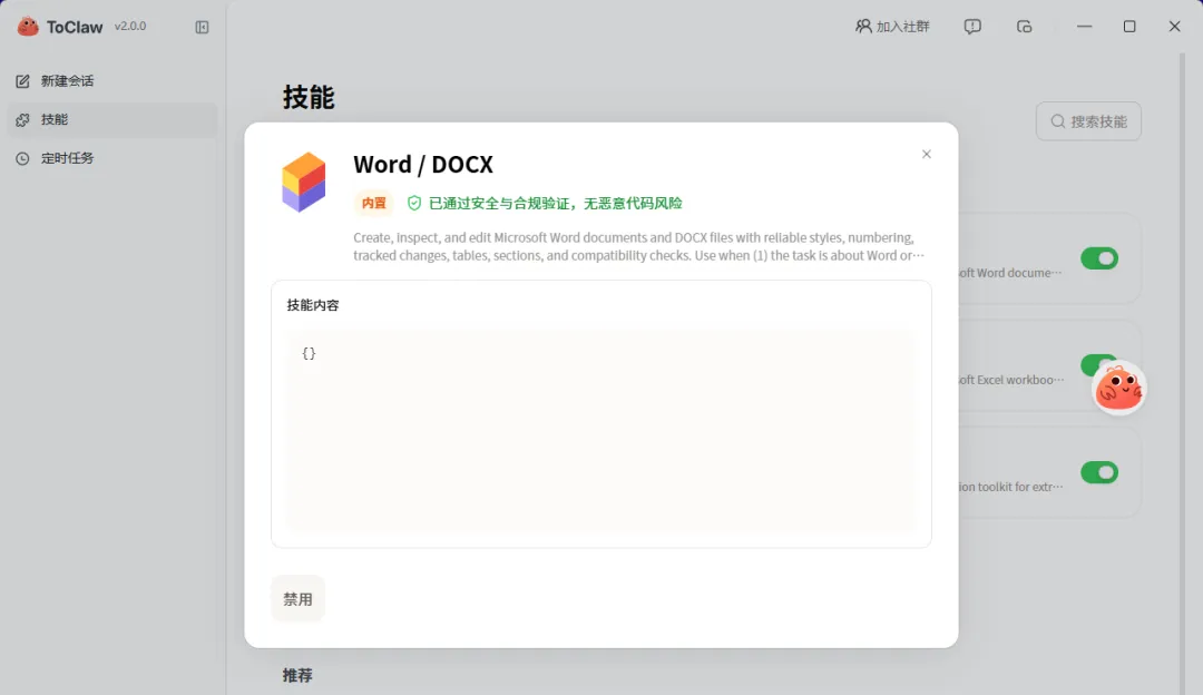 在技能页里,已经能看到 Word / DOCX、Excel / XLSX、PDF、PowerPoint / PPTX、Agent Browser 等模块,部分技能还带有“已通过安全与合规验证”的提示。这个信号很明确:ToClaw 不是想做一个万能聊天框,而是想把桌面办公里最常见的文件和网页操作,逐步做成可调用能力。