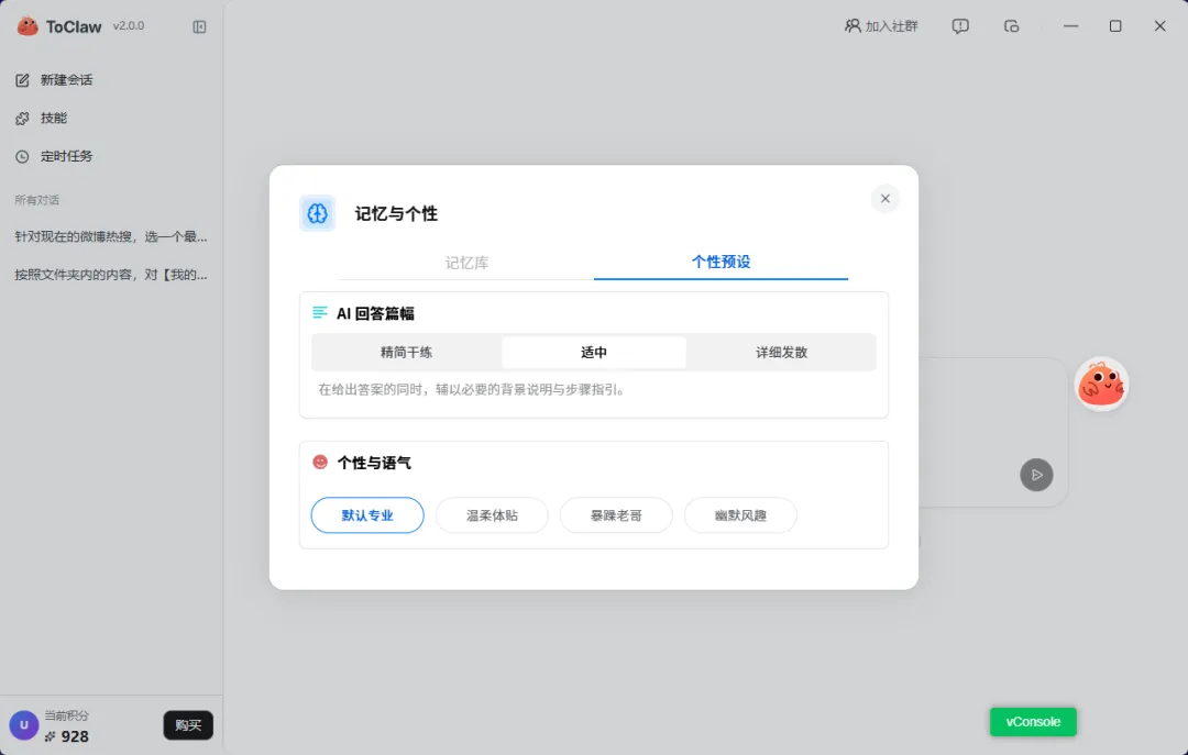 ToClaw 现在已经有回答篇幅、语气风格这类预设,比如默认专业、温柔体贴、幽默风趣等。别小看这个功能,它意味着产品开始考虑“长期协作感”了。你不是每次都在调用一个冷冰冰的模型,而是在慢慢调教一个更适合你工作习惯的数字助理。