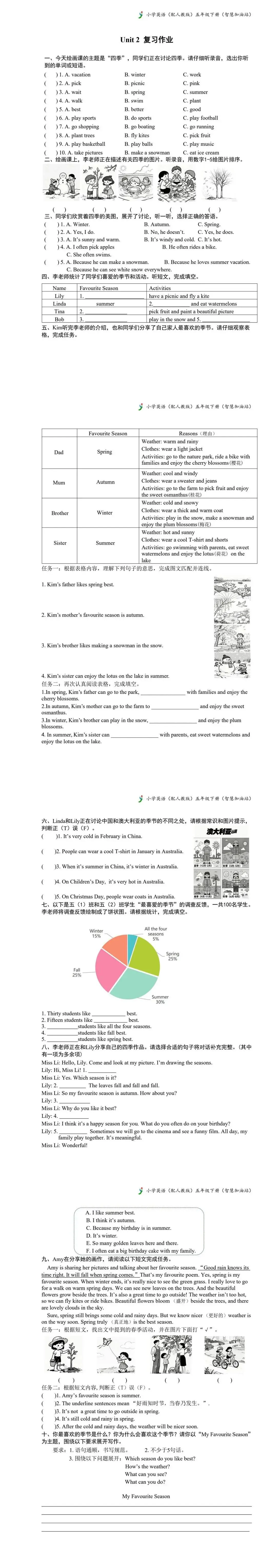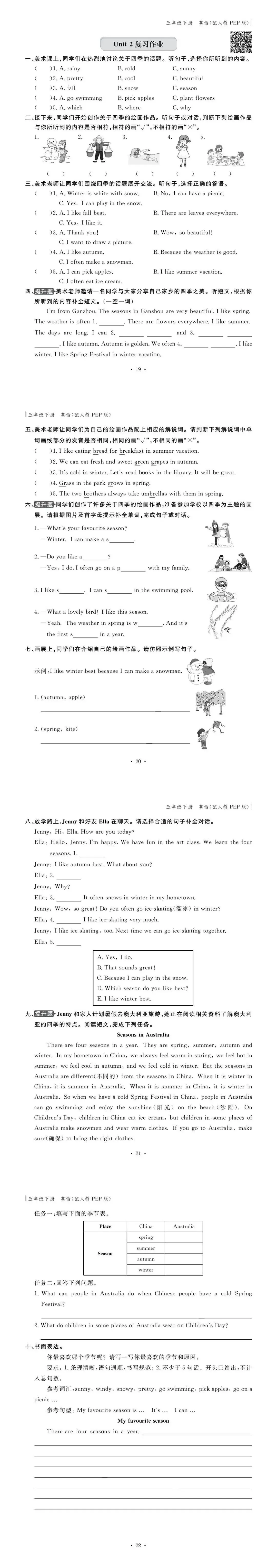 PEP人教版五年级英语下册提升性作业