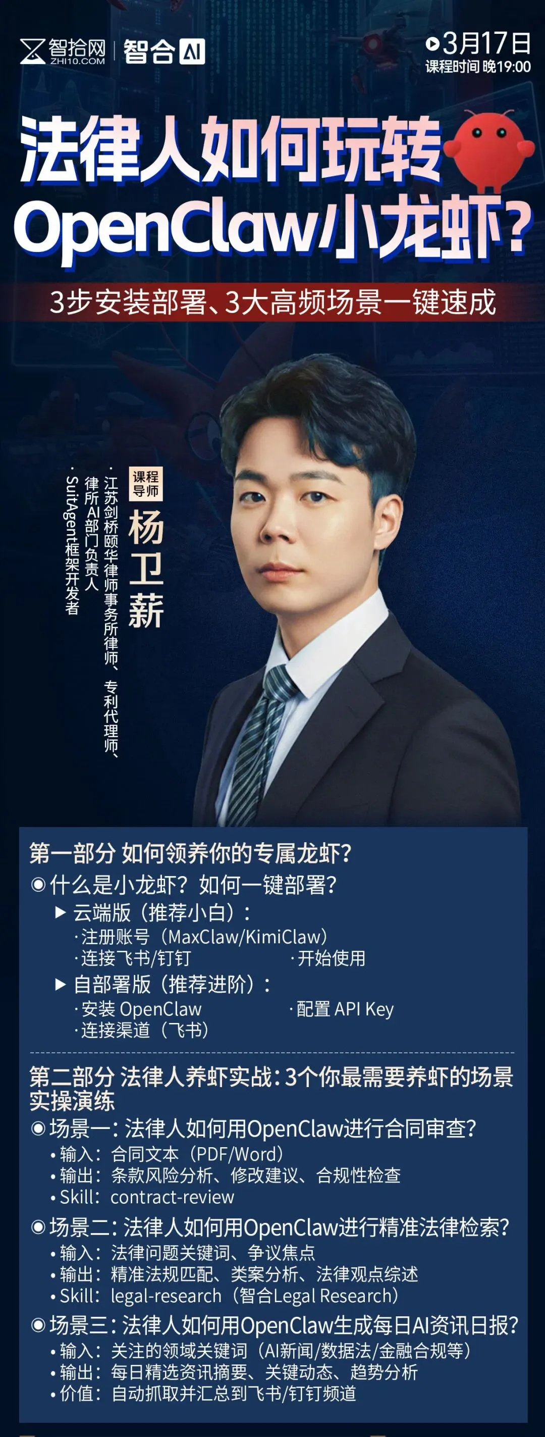 3月17日19:00,智拾网邀请到AI法律实战专家、江苏剑桥颐华律师事务所杨卫薪律师,精讲法律人的OpenClaw小龙虾实操指南。