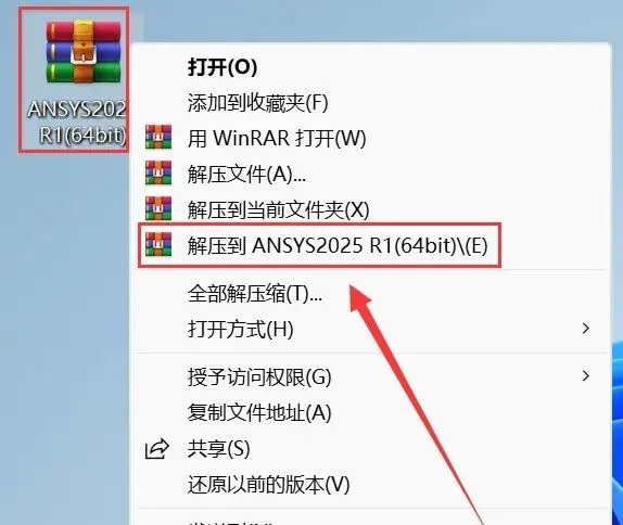 1.解压安装包:鼠标右击【ANSYS2025 R1(64bit)】压缩包,选择电脑上安装的解压软件,点击【解压到ANSYS2025 R1(64bit)】。