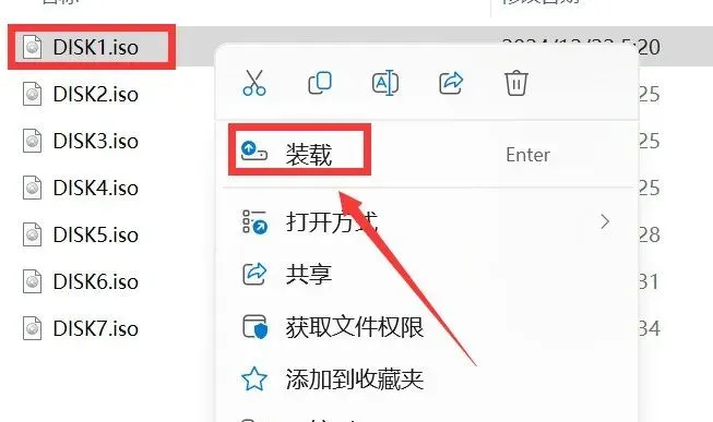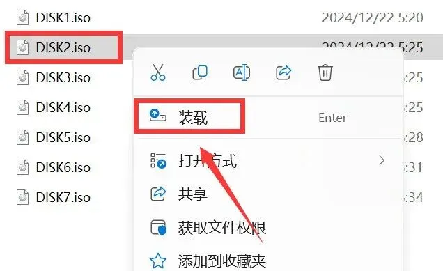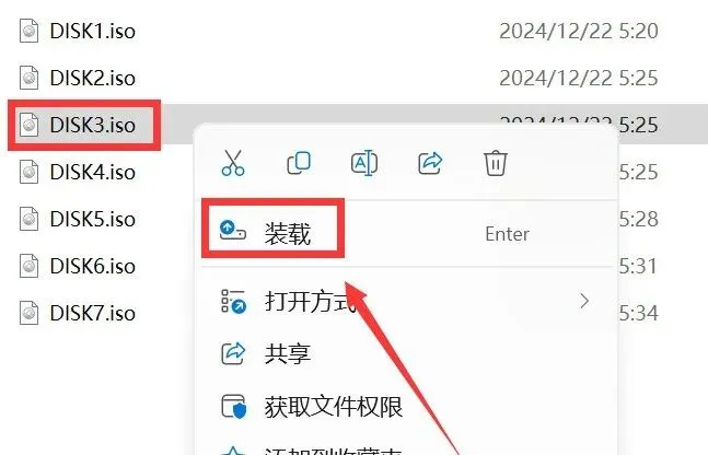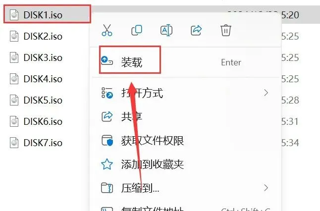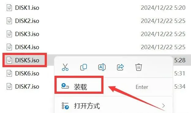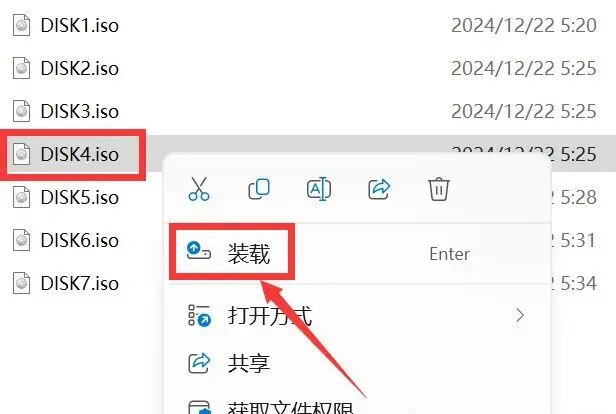 3.鼠标右击【DISK1】选择【装载】(如没有装载选项,请选择用“打开方式—Windows资源管理器”)。
