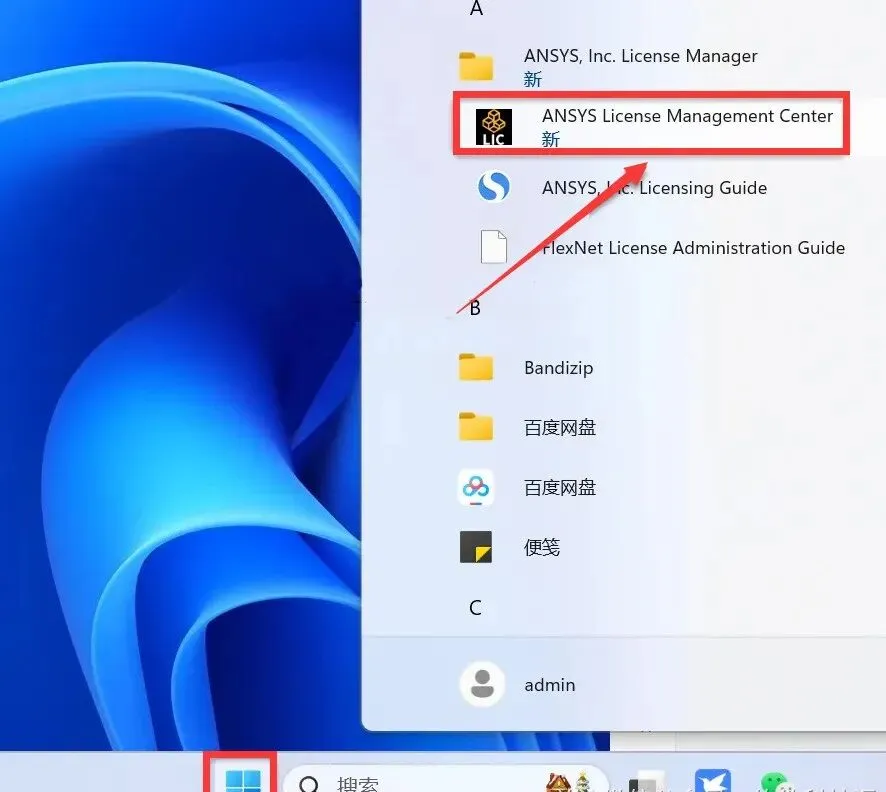 17.点击桌面任务栏中的【开始图标】>点击【所有应用】>双击展开【ANSYS,Inc……】文件夹,点击【ANSYS License Manager Center】。
