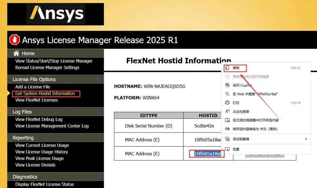 18.点击【Get Systeam Hostid……】,选中第三格“Mac Address”后的字符鼠标右击选择【复制】。
