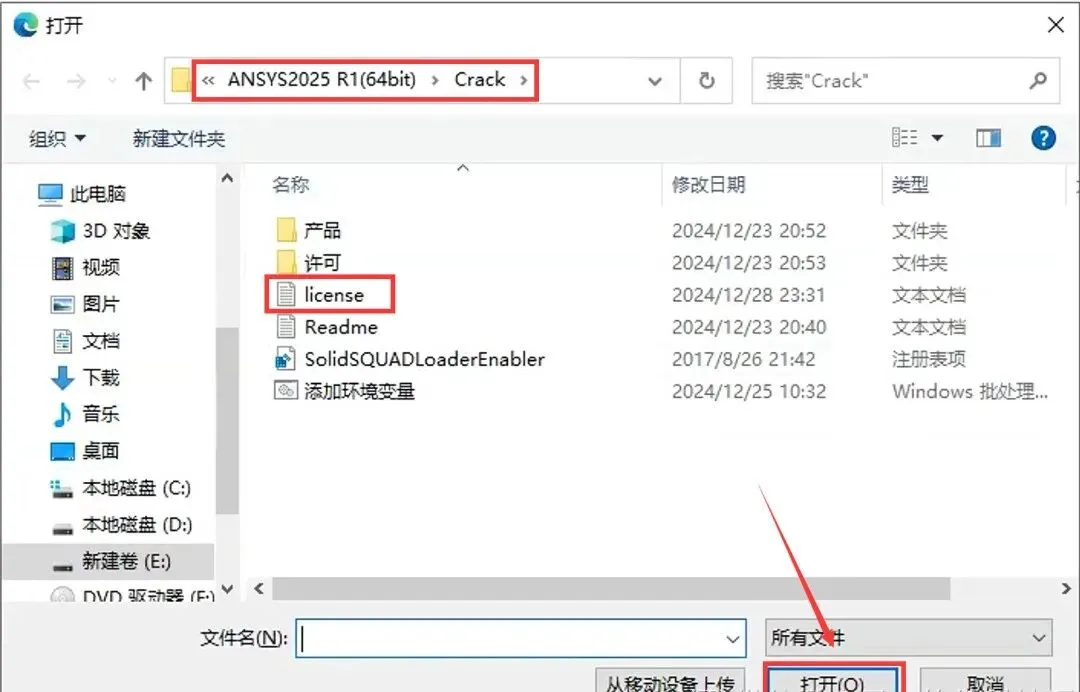 23.选择安装包解压后的【ANSYS2025 R1(64bit)】文件夹中【Crack】文件夹下的【license】,点击【打开】。