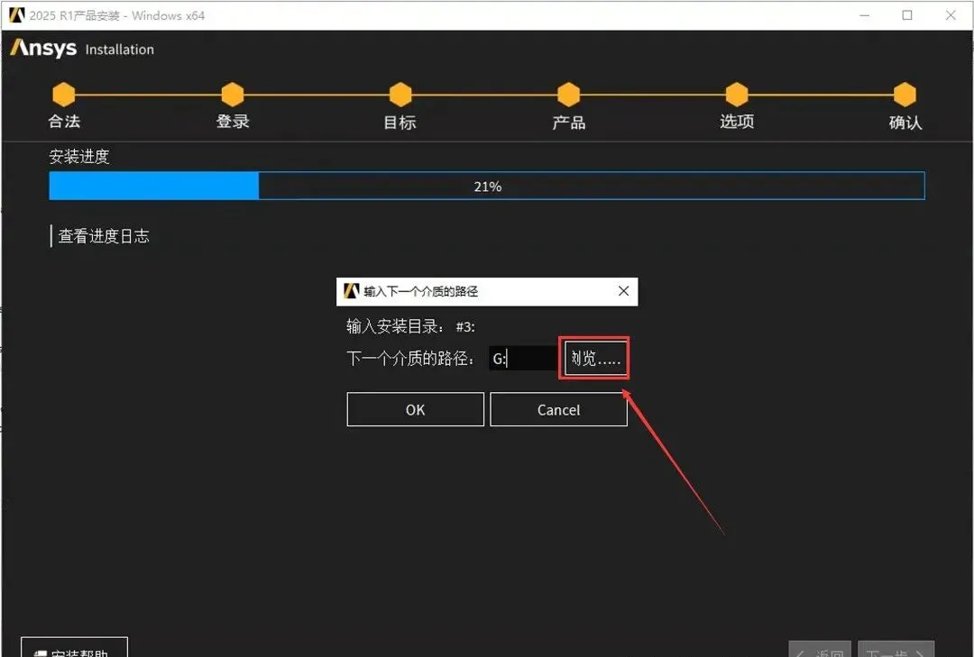 46.当安装进度到21%时,点击【浏览..】。