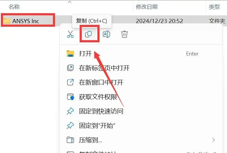 14.打开安装包解压后的【ANSYS2025 R1(64bit)】文件夹,依次打开【Crack\许可】文件夹,鼠标右击【ANSYS Inc】选择【复制】。