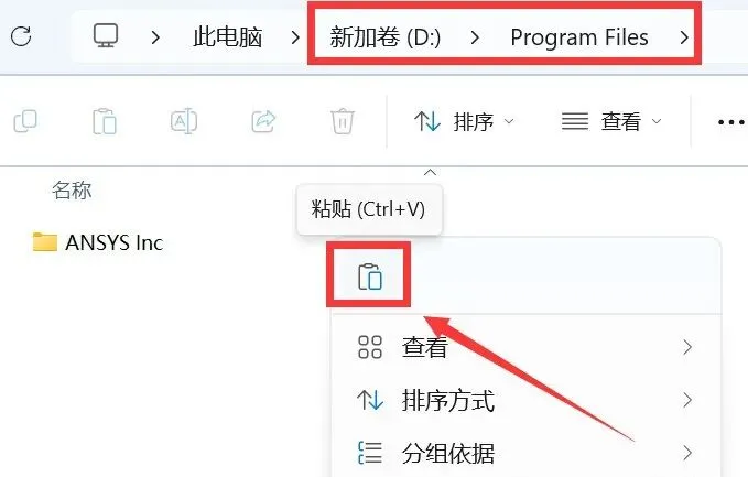 15.打开许可安装路径【D:\Program Files】(如您在步骤8修改为其他位置,选择对应位置打开),鼠标右击空白处选择【粘贴】。
