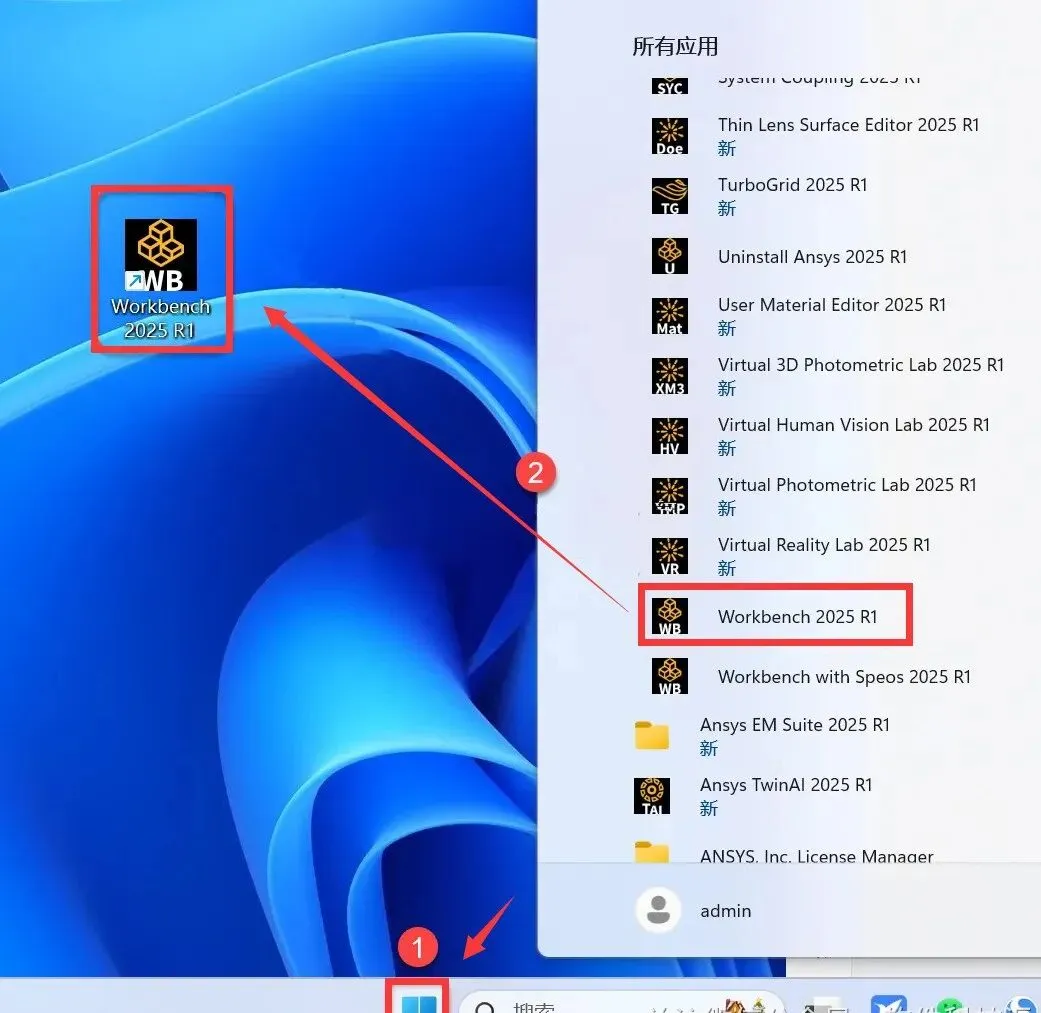 ①如创建【Workbench】桌面快捷方式:点击桌面任务栏中的【开始图标】>点击【所有应用】>双击展开【ANSYS 2025R1】文件夹②将【Workbench】图标拖到电脑桌面。