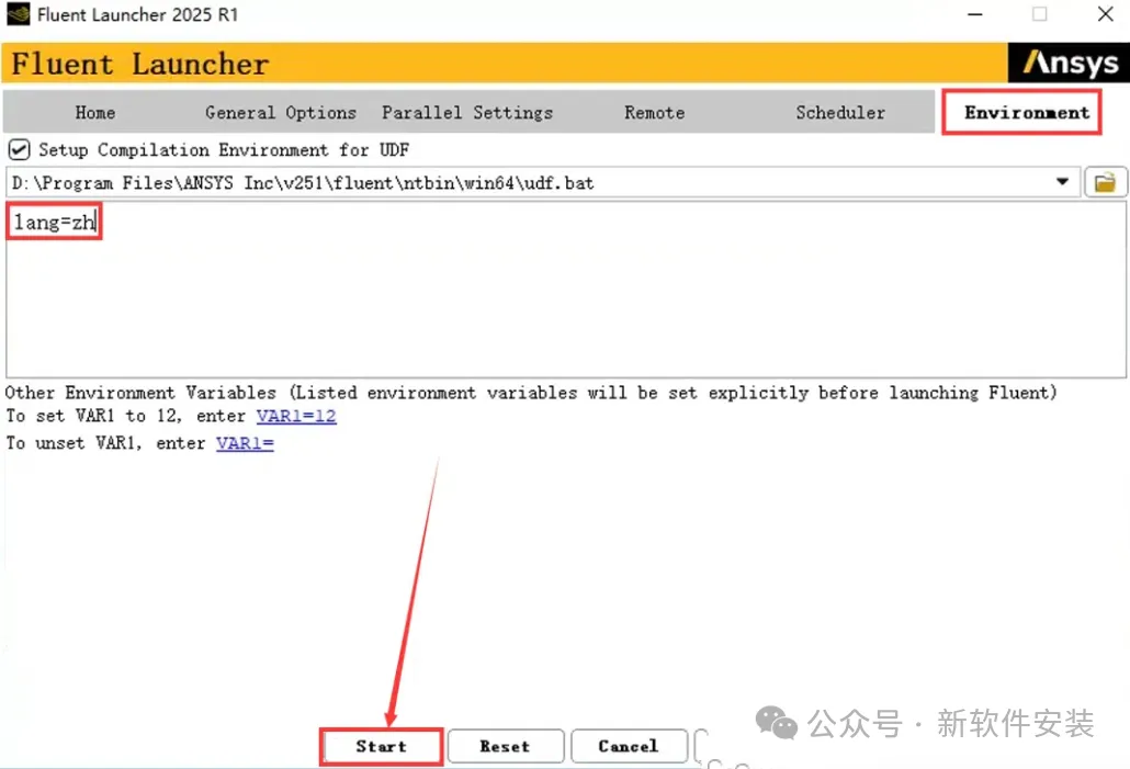 Fluent中文界面启动步骤:①先点击【Enviroment】输入②【lang=zh】③点击【Start】。