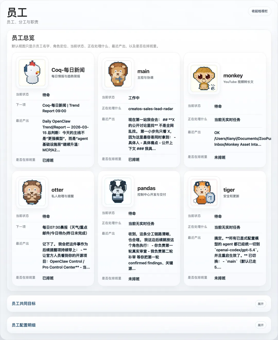 每天需要打开多个终端窗口,才能勉强看清整个 AI 团队的运行状态 想知道"现在谁在真正干活",却只能一条条翻阅会话记录 想查看 Token 消耗去向,却被各种原始 JSON 数据淹没,完全看不懂 新人入职想了解团队协作流程,却发现文档零散在各个 agent 的记忆里