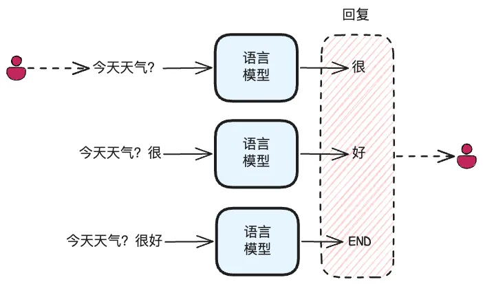 1. 给语言模型输入“今天天气?”,语言模型输出“很” 2. 语言模型将“今天天气?很”作为输入,输出“好” 3. 语言模型将“今天天气?很好”作为输入,输出“ [END]”