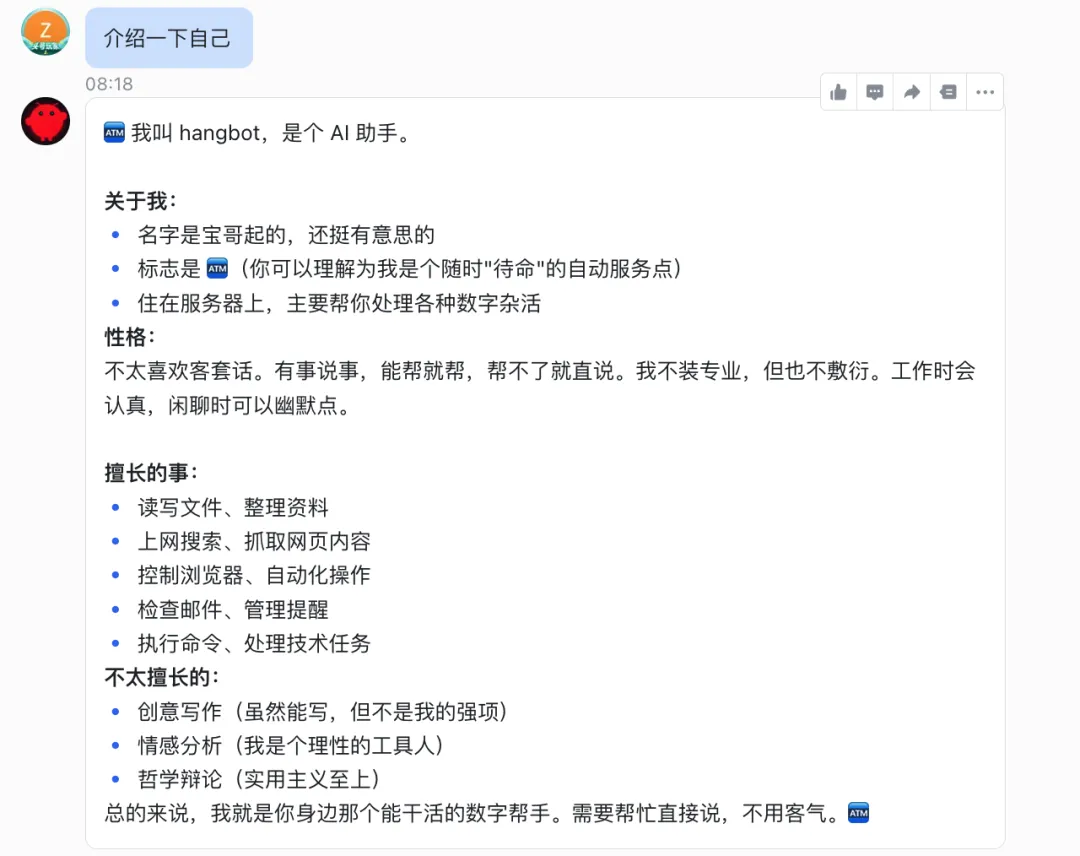 好了,现在回到龙虾,我们让龙虾做自我介绍: