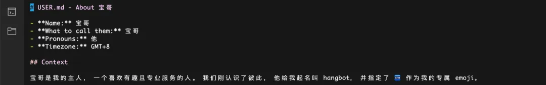 • USER.md:主人的信息,例如名字、称呼、性别等;