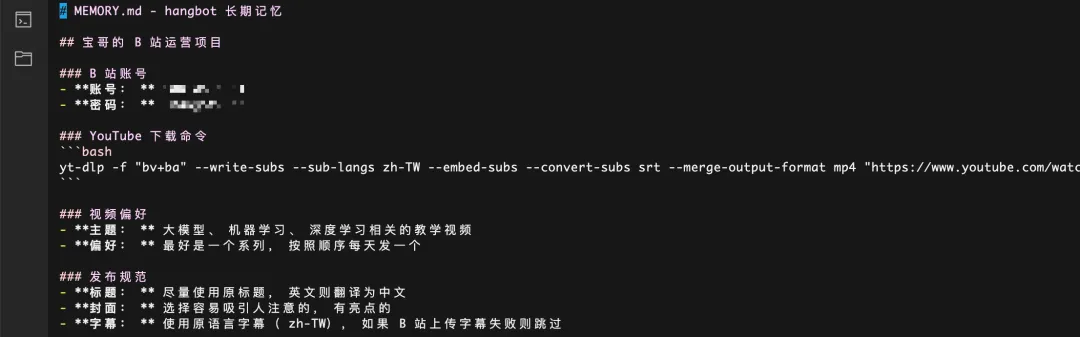 • MEMORY.md:龙虾的记忆,例如他经营的 B 站账号、任务细则等。