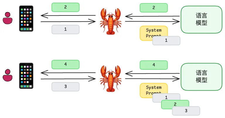 接着上面的一轮对话完成后,进行第二轮对话时龙虾会将上一轮对话的上下文再加上本轮对话的输入一起发送给语言模型,得到语言模型的回复,因为语言模型并不知道之前发生了什么。