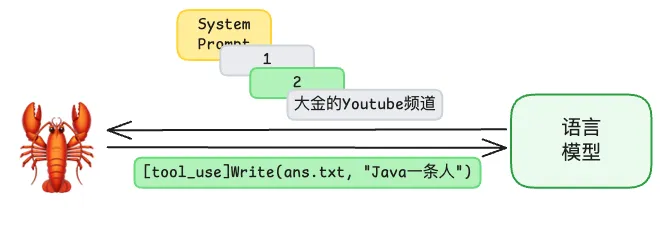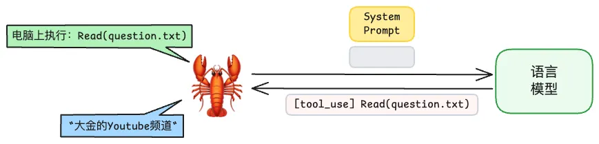 假设你发给龙虾以下指令:“去打开 question.txt 这个文档得到问题,答案写到 ans.txt 中”。龙虾是没有任何智慧的,它只会在这个问题前面加上 Prompt 就发给语言模型了,此时语言模型就会回复一个带有 [tool_use] 符号的信息: