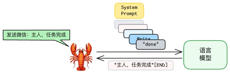 输出 “[END]” 标识后语言模型的输出就结束了,所以,语言模型最终给出的输出会是:很好[END] 。当然,上面给出输入接收输出的并不一定是人类,也有可能是一只龙虾🦞。