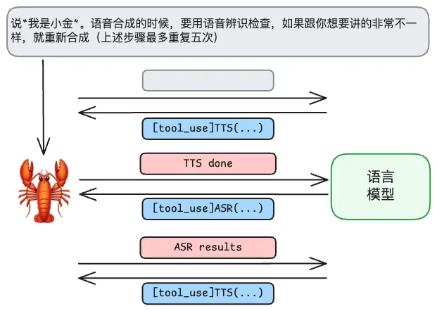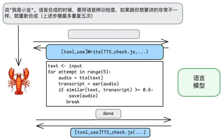 例如,我们让龙虾在使用 TTS 模型合成语音时,要检查自己生成的语音结果,如何和自己的语音差异较大就重新合成(最多重复五次)。我们最先想到的流程可能是: