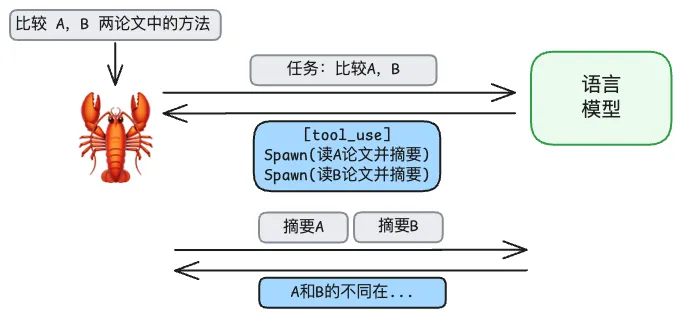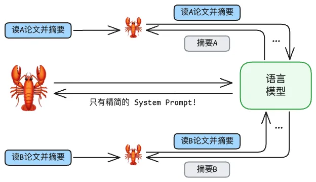 Sub-agent 可以解决这一问题。语言模型可以让龙虾使用 Spawn 工具(又一个重要工具)要求龙虾生成子会话(Sub-agent),每个“繁殖”的小龙虾负责一篇论文的摘要生成,这样大龙虾无需关注小龙虾的上下文,只需要等待它们返回摘要内容即可: