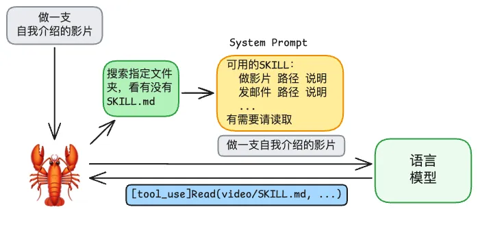 龙虾在一开始和语言模型互动时,不会直接把 SKILL 的完整内容给它,而是先告诉它有哪些 SKILL 分别能做什么。如果语言模型需要,才会让龙虾去读取 SKILL.md 的内容,这也是 Context Engineering 的技巧之一。