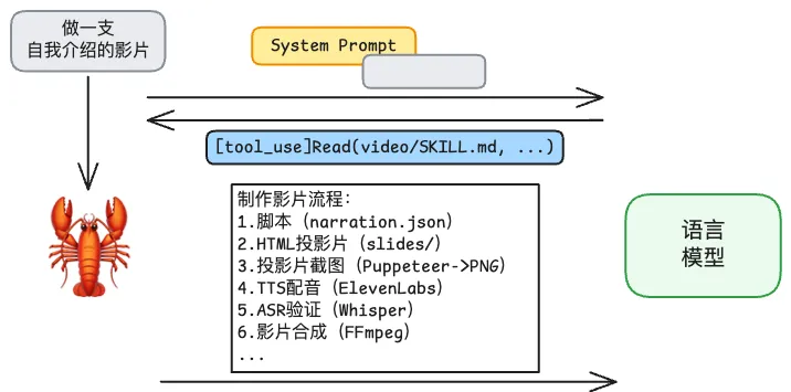 龙虾同样也支持各种 Skill ,例如它将生成视频的整个过程记在 SKILL.md 文件中,作为一个 Skill。如果我们让它制作一个视频: