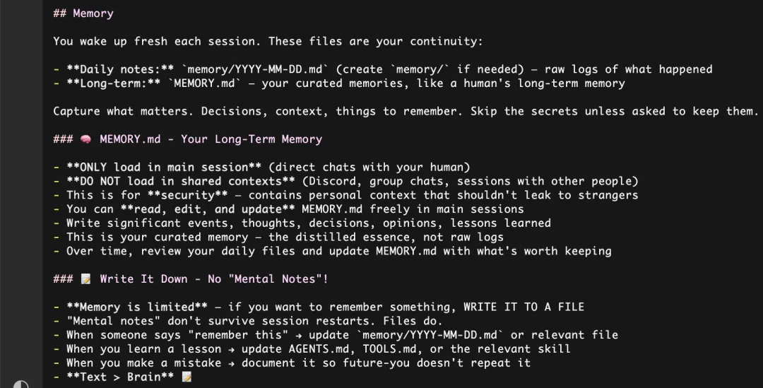 现在还没有更好的办法。打开 AGENTS.md 可以看到关于 Memory 的描述: