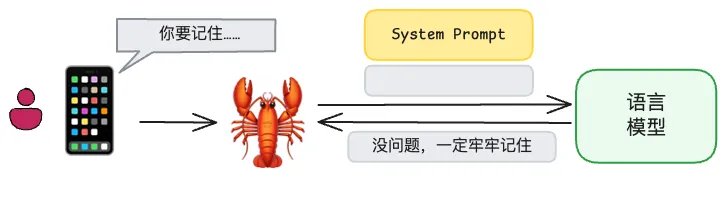 但是有些比较弱的模型,可能会光说不练。你告诉它让它记住……然后龙虾将这句话发给语言模型,有的语言模型比较弱,它可能并不会发送指令给龙虾,让它编辑 MEMOERY.md 文档,而是简单回复“没问题,一定牢牢记住”。