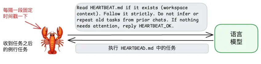 和其他 AI Agent 相比,龙虾还有一个特有的机制:心跳(HEARTBEAT)机制。龙虾会每隔一段固定时间戳一下语言模型,对语言模型发送一段固定的指令,然后语言模型返回执行 HEARTBEAT.md 任务的指令: