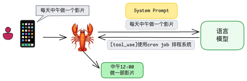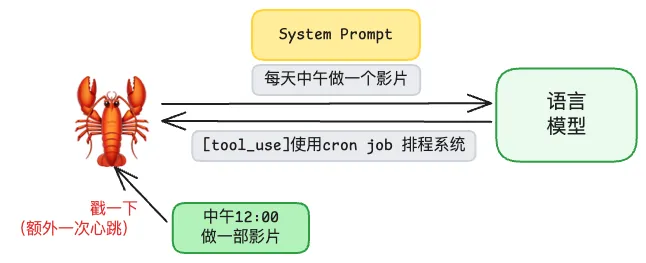 然后每天到 12:00 时, Cron Job 系统就会戳一下龙虾,相当于一次额外的心跳,并把这个任务的内容发给它,然后由龙虾请求语言模型执行。