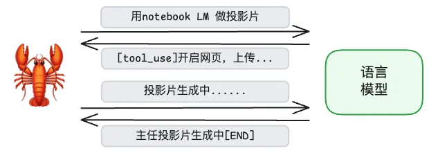 龙虾按照语言模型的指示写好脚本后,语言模型再发出执行脚本的指令,由龙虾去执行。