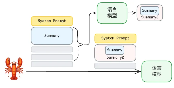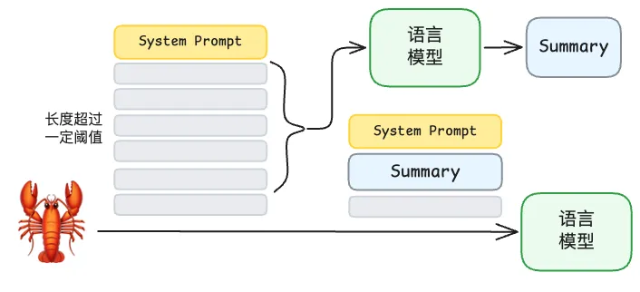 龙虾运作过程中上下文会越来越长,Context Compression 机制旨在通过语言模型对上下文进行压缩,以精简上下文。龙虾在 Context 长度超过一定阈值时,会把比较旧的对话丢给语言模型,告诉语言模型摘要这些对话: