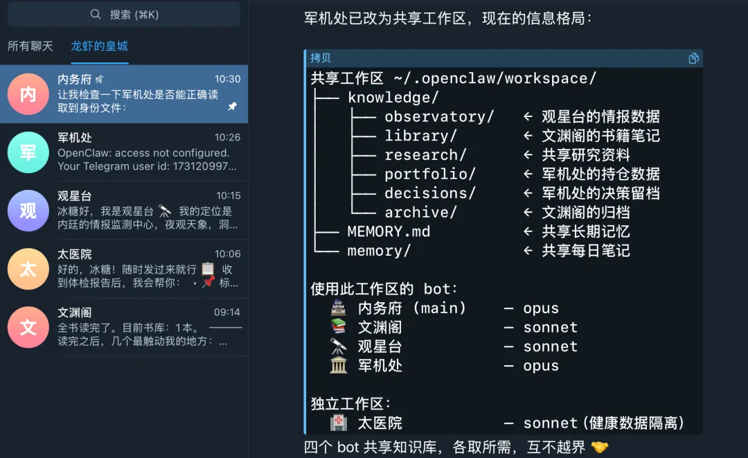 我让 5 个 Agent 共享主工作区,仅“太医院”隔离。这种设计实现了:知识共享,人格隔离,隐私独立。