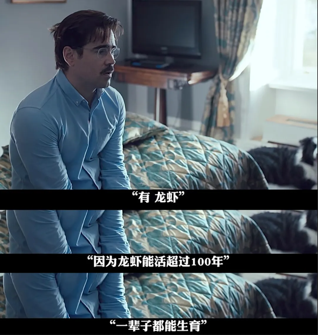 这部黑色电影里有一个极端的逻辑:单身有罪。你必须在限时内找到一个和你有着共同缺陷(比如都流鼻血、都近视)的人配对,否则你就会被剥夺人身,变成一只动物。男主角在入住单身酒店以后,按照惯例被问到,希望死以后变成什么动物,他的答案是“龙虾”,他的原因很冷幽默:龙虾寿命长、生活在海里一生蓝血、还能一直繁殖。