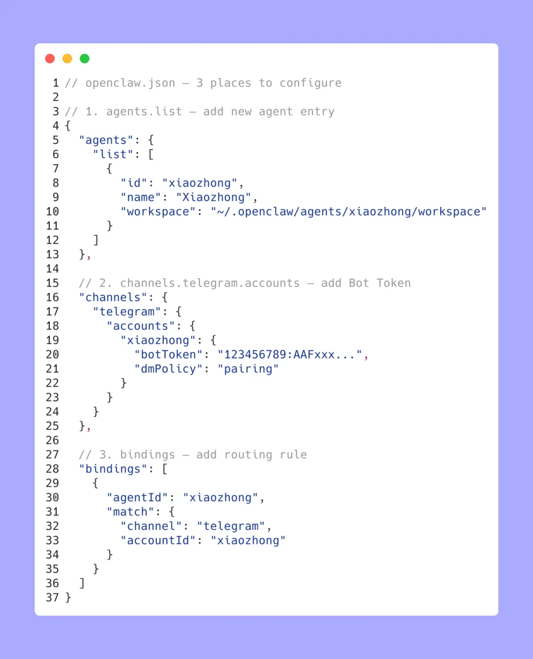 "xiaozhong":{"botToken":"123456789:AAFxxx...","dmPolicy":"pairing"}第三处:bindings 加路由规则