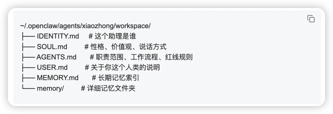 IDENTITY.md— 这个助理是谁 SOUL.md— 性格、价值观、说话方式 AGENTS.md— 职责范围、工作流程、红线规则 USER.md— 关于你这个人类的说明 MEMORY.md— 长期记忆索引