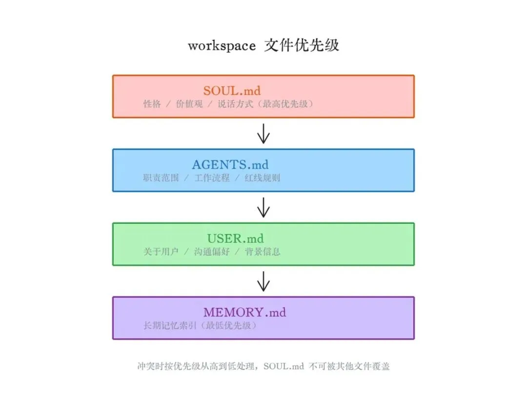 一个优先级要记住:这几个文件的优先级是 SOUL.md > AGENTS.md > USER.md > MEMORY.md。它们之间有矛盾时,助理按优先级高的来。配置时保持一致,不然助理表现会不稳定。