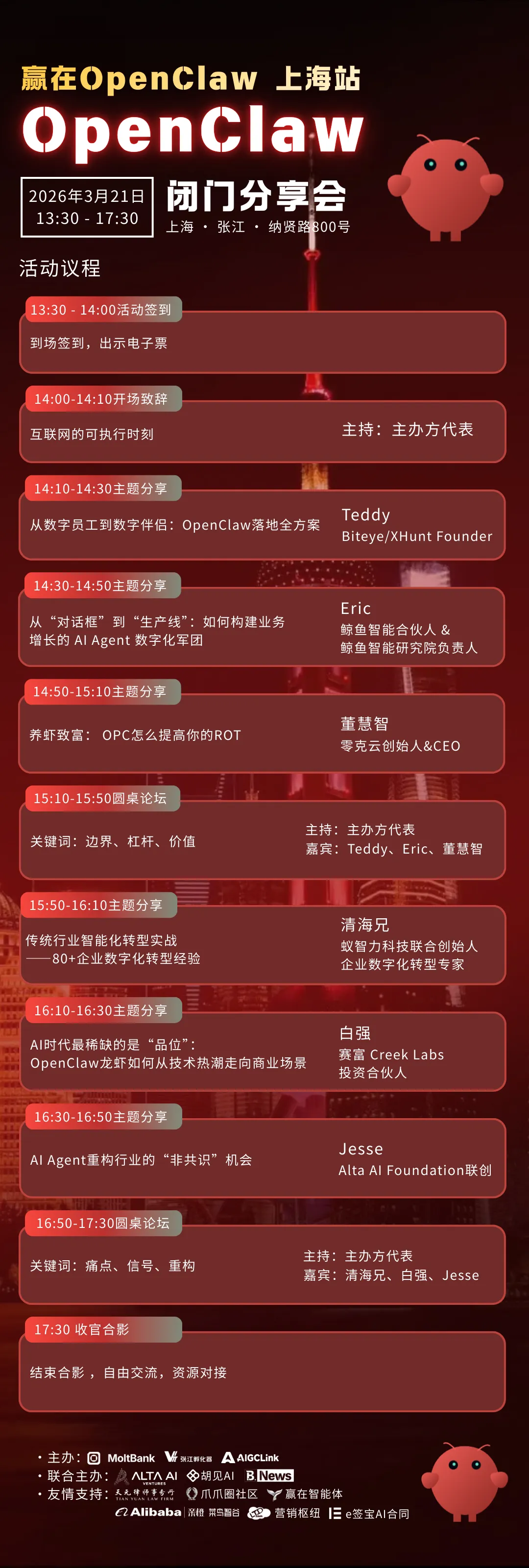 为此,MoltBank、Vπ张江孵化器、AIGCLINK联合发起「赢在OpenClaw・上海站」线下闭门分享交流活动,将于3月21日下午在上海浦东・纳贤路800号一层正式开启。