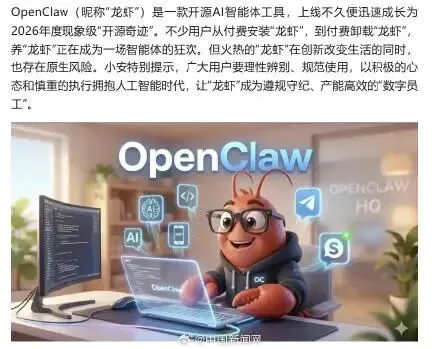OpenClaw(俗称“龙虾”)是一款开源AI智能体工具,上线不久便迅速成长为2026年度现象级“开源奇迹”。不少用户从付费安装“龙虾”,到付费卸载“龙虾”,养“龙虾”正在成为一场智能体的狂欢。但火热的“龙虾”在创新改变生活的同时,也存在原生风险。