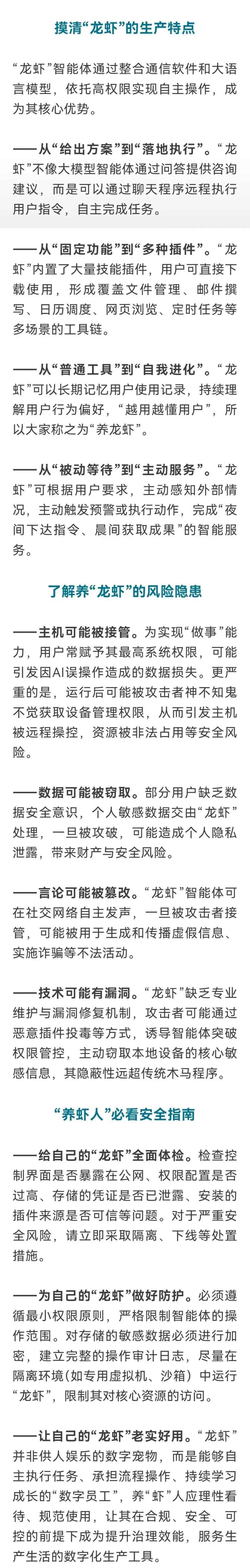 3月17日,国家安全部发布“龙虾”(OpenClaw)安全养殖手册,提示广大用户要理性辨别、规范使用,以积极的心态和慎重的执行拥抱人工智能时代,让“龙虾”成为遵规守纪、产能高效的“数字员工”。
