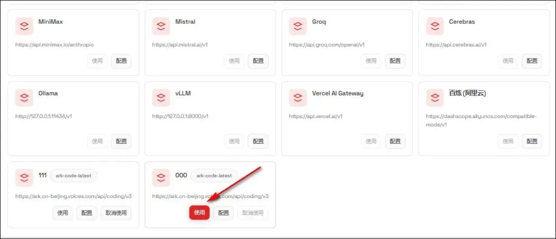 ID、展示名称可随意填 API Key,在火山方舟官方获取API Key Base URL,https://ark.cn-beijing.volces.com/api/coding/v3 Model,填ark-code-latest