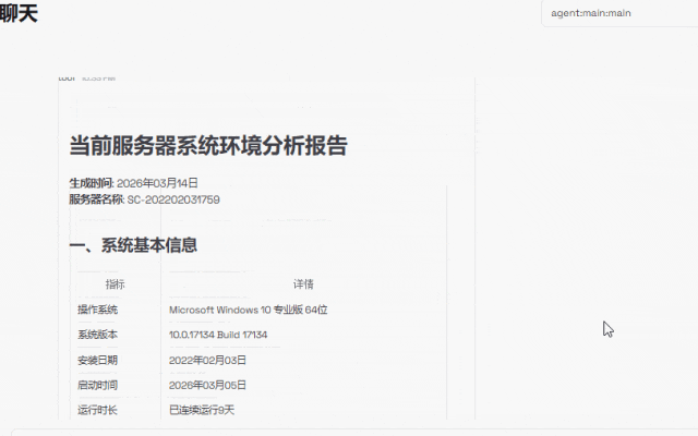 输入帮我分析当前Windows服务器的系统环境,很快就给我输出了一份“当前服务器系统环境分析报告”告诉我操作系统版本、CPU、内存、磁盘、运行时间等核心信息。