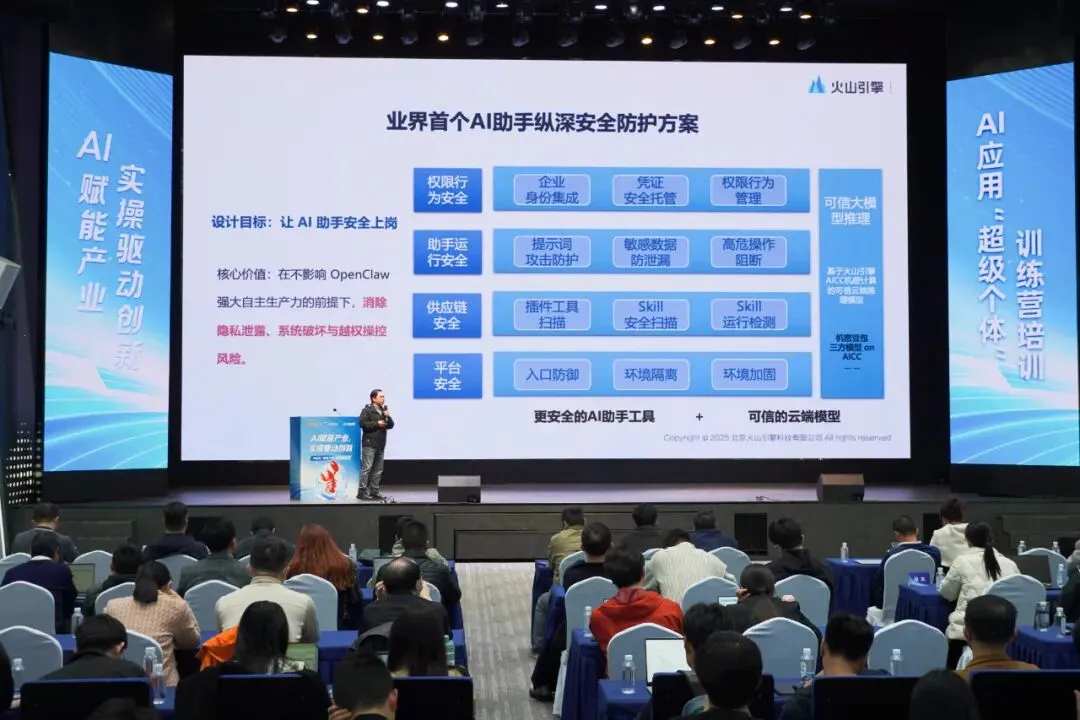 江烨林则围绕企业最关注的安全问题,详细讲解ArkClaw安全应用方案,从环境安全、身份安全、高危操作管控和敏感数据保护等多个层面,从剖析AI工具应用过程中的安全风险点,到给出针对性的防范措施与解决方案,为企业安全、合规使用ArkClaw筑牢防线。