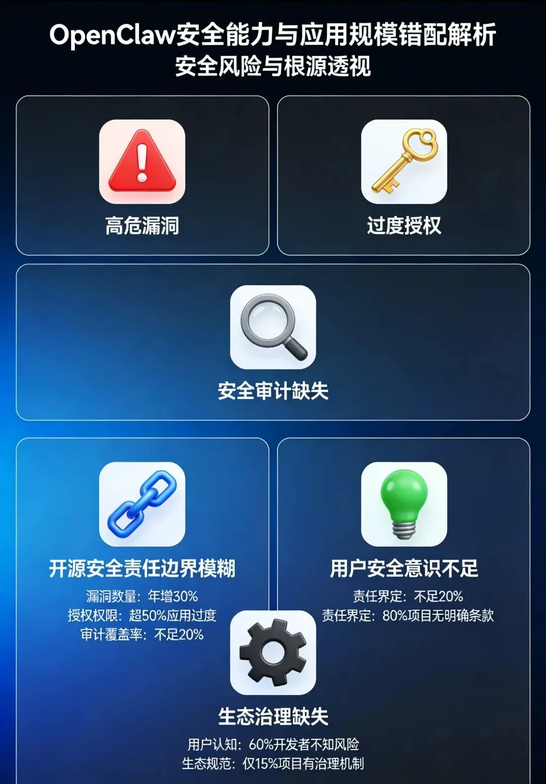 这种错配的核心根源在于三个层面:一是开源项目的安全责任边界模糊,开源社区仅提供基础代码,安全防护的责任完全转移给用户,而绝大多数用户不具备专业的安全审计与防护能力;二是用户安全意识严重不足,多数用户只关注智能体的提效能力,完全忽视其“自主执行”特性带来的不可逆风险,为了便利随意开放最高权限、使用不明插件;三是开源生态的安全治理缺失,技能市场的第三方插件缺乏强制审核机制,成为供应链攻击的核心突破口,最终形成了“人人都在用,处处有风险”的行业现状。