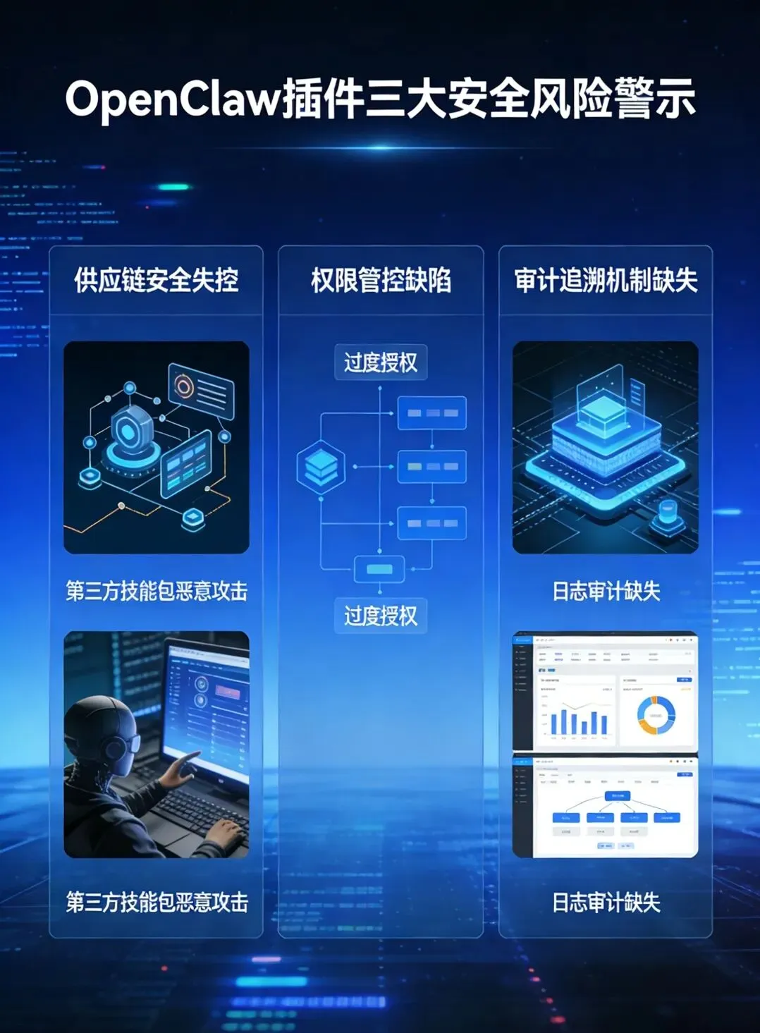 与OpenClaw快速普及形成鲜明对比的,是全行业安全防护能力的严重缺失。西安电子科技大学网络空间安全学院的攻防调研数据显示,国内已部署的OpenClaw实例中,超过83%存在高危安全漏洞,76%的实例存在过度授权问题,68%的实例未开启完整日志审计功能,91%的第三方技能包未经过完整的安全审计。